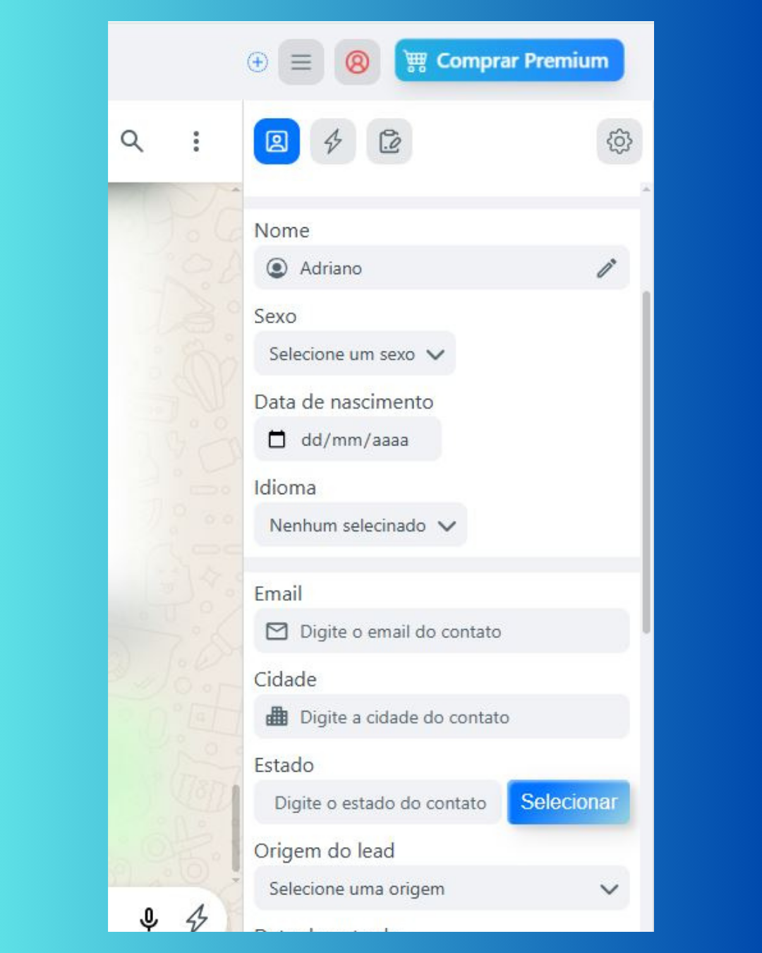 Direto da conversa com o seu contato, você pode conferir e atualizar informações no CRM. Mude informações referentes ao lead, defina uma nova origem, etapa, dono do negócio, valores, tags, faça anotações e mais.